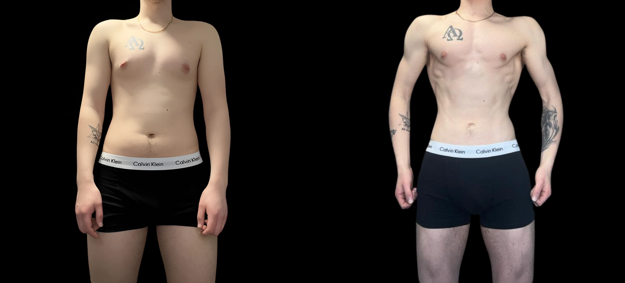 Unhappy with how he looked he knew changes needed to be made. After an initial fat loss phase, we started to build back into a surplus to start putting some muscle on and now feels so much more confident without his top on.